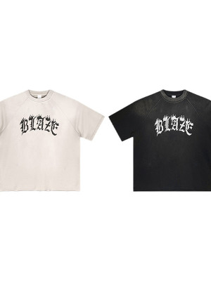 OEM T-shirt | Cool flame font printed t-shirts | Black streetwear t-shirt | Patchwork fabric t-shirt