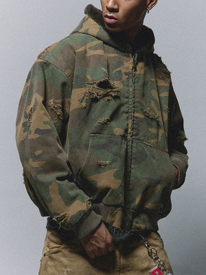 Camo distressed jacket | Army green hooded jacket | Thick winter lambswool jacket | Jackets factory